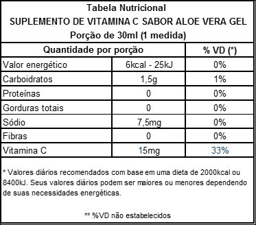 SUPLEMENTO DE VITAMINA C SABOR ALOE VERA GEL ORAL 100% puro Aromatizante natural de Aloe vera gel 100% estabilizado, Carboximetilcelulose, Sorbato de Potássio, Vitamina C, edulcorante natural Estévia. NÃO CONTÉM GLUTEN. NÃO CONTEM LACTOSE.