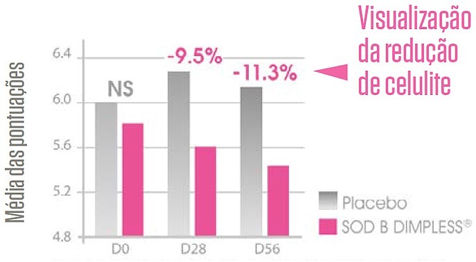 Dimpless® é o único ativo oral com ação comprovada por estudo clínico na redução da aparência da celulite. Através de mecanismos diversos, a SOD previne e reduz o desenvolvimento de condições inflamatórias da pele, o processo de deposição de gordura e a celulite de maneira geral. A atividade dessa enzima (maior que 12.000 IU/g) presente noDimpless® é protegida da acidez gástrica pelo processo de revestimento patenteado com óleo de palma, permitindo o seu alcance no trato gastrointestinal.