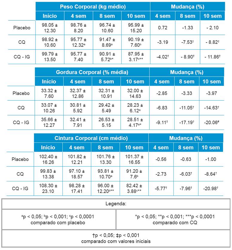 Resultados: Em comparação com o grupo placebo, os dois grupos ativos mostraram uma diferença estatisticamente significativa na semana 10, conforme mostram as tabelas: