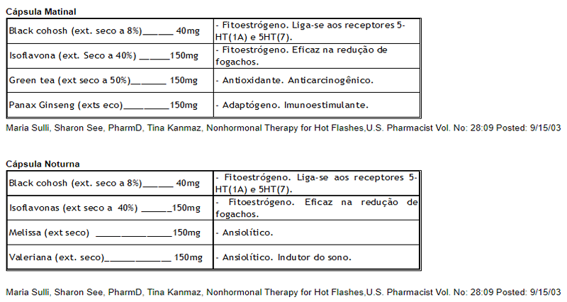 Frasco 1 - Composto não hormonal para a menopausa – Cápsula Matinal Black cohosh extrato seco 8% 40mg Isoflavonas extrato seco 40% 150mg Green tea extrato seco 50% 150mg Panax ginseng extrato seco 4% 150mg Frasco com 30 cápsulas sem corante Modo de tomar: Tomar 1 cápsula pela manhã em jejum. Frasco 2 - Composto não hormonal para a menopausa – Cápsula Noturna Black cohosh extrato seco 8% 40mg