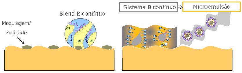 SISTEMA INOVADOR BICONTÍNUO - Demaquilante bifásico A maquiagem é removida de forma eficaz devido à interface oleosa da solução (conceito “óleo remove óleo"). Os canais bicontínuos de água e óleo permitem uma miscibilidade em água e a absorção de maquiagem. Com a adição de mais água, o tamanho das gotículas de óleo são reduzidas e estabilizadas em micelas prevenindo a “re-adesão” e permitindo o fácil enxague. Assim, este sistema funciona mesmo com as mãos molhadas e não há a necessidade de duplo enxágue para a remoção do aspecto pegajoso das substâncias oleosas na pele.