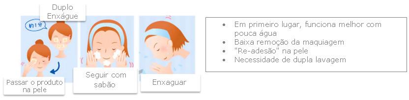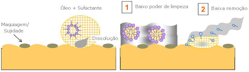 SISTEMA TRADICIONAL: ÓLEOS + SURFACTANTE – Outros demaquilantes Nesse sistema a maquiagem é removida devido à sua natureza lipofílica (conceito “óleo remove óleo"). Com as mãos molhadas, gotículas de óleo serão criadas (emulsificação), mas a água impede a adesão das gotículas suspensas na maquiagem. A água também irá aumentar o tamanho de partícula destas gotículas de óleo, permitindo a possibilidade de "re-adesão" na pele. Assim, este sistema funciona melhor com pouca água em primeiro lugar e há necessidade de lavagens para remover a sensação pegajosa.