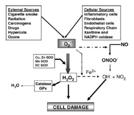 Figura 1: Desenvolvimento de espécies reativas de oxigênio e sistema antioxidante de defesa.