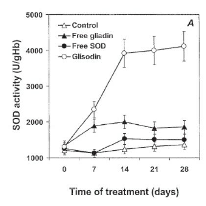 GliSODin® é a única forma de suplementação da superóxido dismutase (SOD) eficaz por via oral diferentemente da maioria dos suplementos de SOD existentes. A matriz de gliadina além de proporcionar proteção entérica, também é um veículo de liberação da SOD, graças às propriedades bioadesivas com as células epiteliais no intestino.