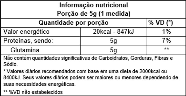 Ingredientes: L-Glutamina. NÃO CONTÉM GLÚTEN.
