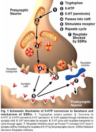 Os níveis de serotonina no cérebro são altamente dependentes dos níveis de 5-HTP e LT no sistema nervoso central (SNC). O 5-HTP atravessa facilmente a barreira hematoencefálica, não requerendo a presença de uma molécula transportadora. Por outro lado o LT requer o uso de um transportador para obter acesso ao SNC.