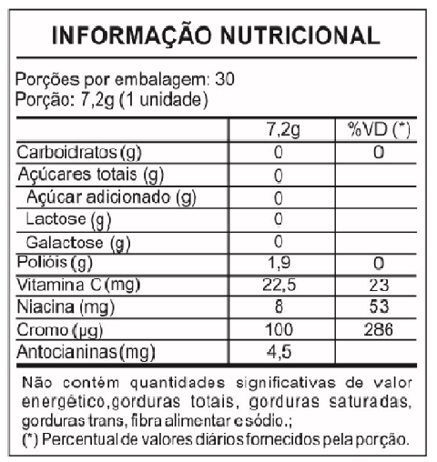 Extrato de Laranja Moro (Morosil®) 500mg, Extrato de Cranberry (Vaccinum macrocarpon - Fruto), água, vitamina C, niacina, picolinato de cromo, geleificante pectina, edulcorantes maltitol, xilitol, glicosídeos de steviol, aroma idêntico ao natural de tangerina, acidulante ácido cítrico, corante natural de beterraba. -
