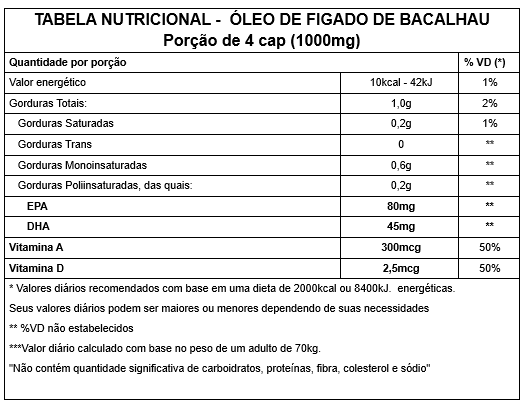 O Óleo de Fígado de Bacalhau é um suplemento alimentar completo, naturalmente rico em vitaminas A e D, além de conter ácidos graxos essenciais ômega-3 (EPA e DHA). Esses nutrientes são fundamentais para o bom funcionamento do organismo, contribuindo para o desenvolvimento ósseo, fortalecimento da imunidade, saúde da pele, dos olhos e muito mais.