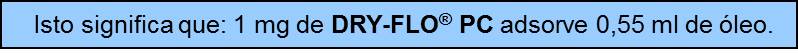 O teste de adsorção de óleo avaliou a quantidade, em ml, de óleo adsorvida por 1 g de Dry-Flo® PC em uma bureta em forma de U. De acordo com os resultados, o Dry-Flo® PC adsorveu uma quantidade significativa de óleo: 0,55 ml/mg.