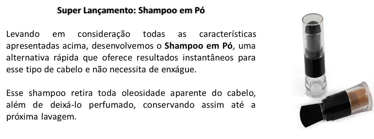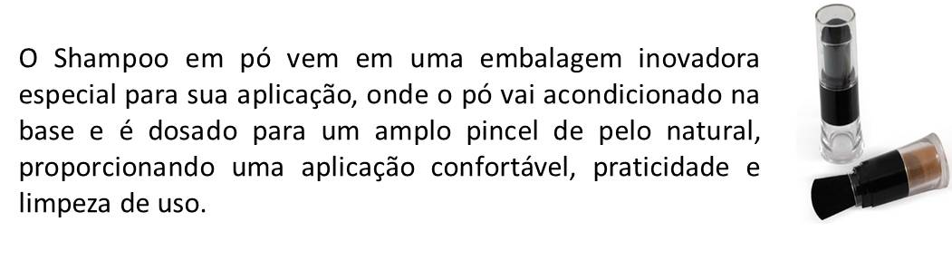 O Shampoo em Pó pode ser aplicado diretamente sobre o couro cabeludo sem a necessidade de enxágue. Ele irá adsorver instantaneamente toda e qualquer oleosidade do mesmo, deixando com aspecto de limpo, sem deixar resíduos visíveis, além de deixar o cabelo com perfume super agradável.