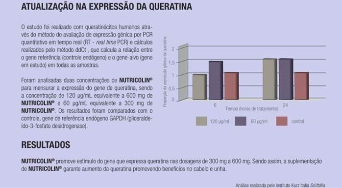 Nutricolin® é um silício biodisponível, que serve como cofator na síntese de colágeno tipo I, importante para a estruturação mecânica e a redensificação da pele, além de aumentar a compactação da queratina aumentando a espessura do cabelo e a resistência à fragilidade das unhas. Essa ação é potencializada pela biotina e por aminoácidos contendo enxofre, sendo associada a queratinização. Além disso, agem na síntese de queratina e são importantes antioxidantes. O N-Acetilcisteína e a cistina são aminoácidos ricos em enxofre, que é importante para o fio de cabelo. As vitaminas B3, B6 e biotina são cofatores, pois potencializam a ação nas unhas e nos cabelos.