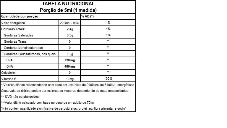 O consumo de Ômega-3 auxilia na manutenção de níveis saudáveis de colesterol e triglicerídeos desde que associado a uma alimentação equilibrada e hábitos de vida saudáveis. Para isso é essencial que seja de boa qualidade. O Omega-3 oferece alta concentração de EPA e DHA e padrões de pureza extremamente rígidos em relação aos metais pesados e demais contaminantes como chumbo, mercúrio e dioxinas. Ideal para adultos, crianças e idosos que não consomem a quantidade suficiente de ômega-3 através da alimentação e possuem dificuldade em aderir à suplementação de cápsulas. Todos os benefícios do ômega-3, conhecidos e propagados na forma de cápsulas, podem ser encontrados também na forma líquida. Fornece gorduras boas que, na maioria das vezes, não são suficientemente obtidas através da alimentação. Seu consumo, associado a uma alimentação equilibrada e hábitos saudáveis, beneficia a saúde geral, dando suporte à integridade do sistema circulatório e equilíbrio às membranas celulares. Benefícios do Ômega 3 Redução de triglicerídeos Melhora no sistema de processos inflamatórios Benefícios aos indivíduos com problemas cardíacos e circulatórios Ajuda no tratamento da depressão e doenças neurológicas Prevenção da resistência insulínica Saúde das articulações Saúde da visão Certificações de excelência